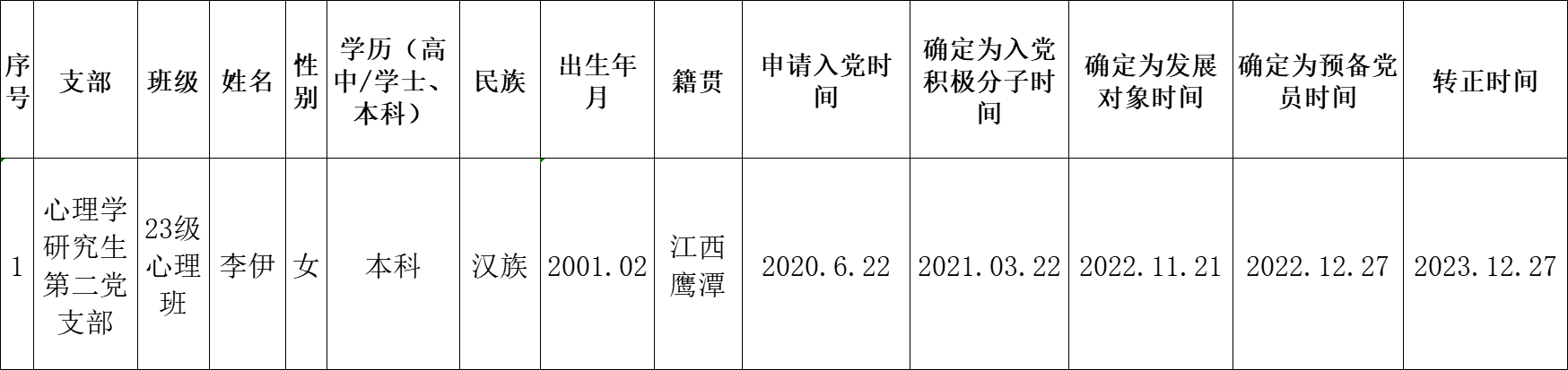 根据《中国共产党发展党员工作细则》中发展党员的文件要求,经对李伊同志的预备党员转正条件、转正程序等进行严格审查。2024年1月16日,学院党委会集体审议讨论了李伊同志的转正问题。党委委员共7名,实到会7名。经逐个审议和表决,7名党委委员一致认为李伊同志已具备正式党员条件,同意批准按期转为中共正式党员,党龄从预备期满转为正式党员算起。具体名单公布如下: