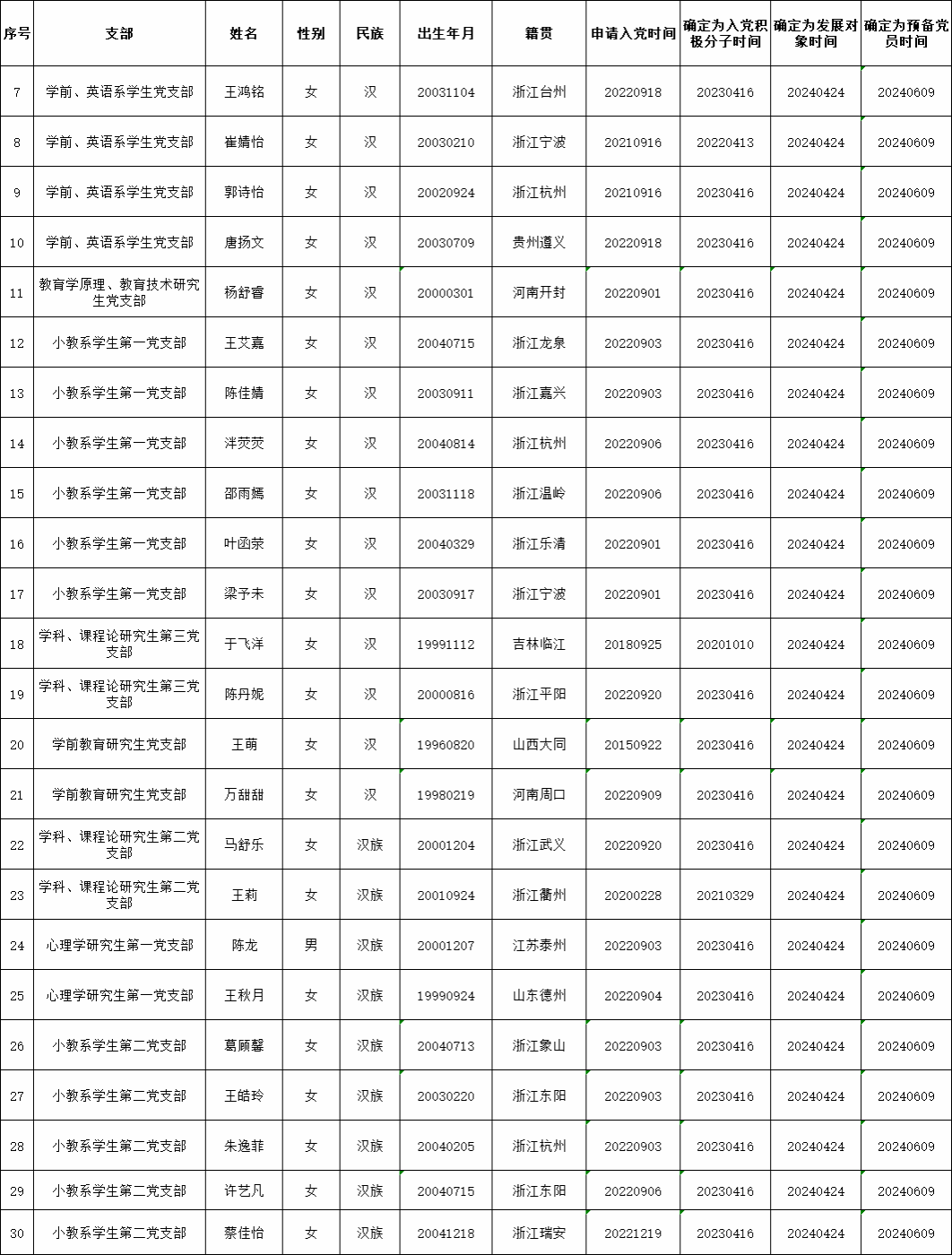 根据《中国共产党发展党员工作细则》中发展党员的文件要求,经对龙奇红等30名同志的接收为中共预备党员条件、接收程序等进行严格审查。2024年6月19日,学院党委会集体审议讨论了龙奇红等30名同志的接收问题。党委委员共7名,实到会7名。经逐个审议和表决,7名党委委员一致认为龙奇红等30名同志已具备预备党员条件,同意批准接收为中共预备党员,预备期为2024年6月9日至2025年6月8日。具体名单公布如下: