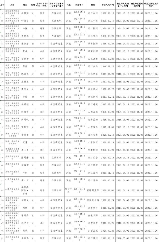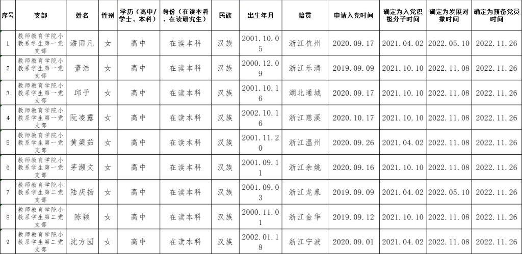 根据《中国共产党发展党员工作细则》中发展党员的文件要求,经对潘雨凡等41名同志的接收为中国预备党员条件、接收程序等进行严格审查。2022年12月8日,学院党委会集体审议讨论了潘雨凡等41名同志的接收问题。党委委员共7名,实到会7名。经逐个审议和表决,7名党委委员一致认为潘雨凡等41名同志已具备预备党员条件,同意批准接收为中共预备党员,预备期为2022年11月26日至2023年11月25日。具体名单公布如下: