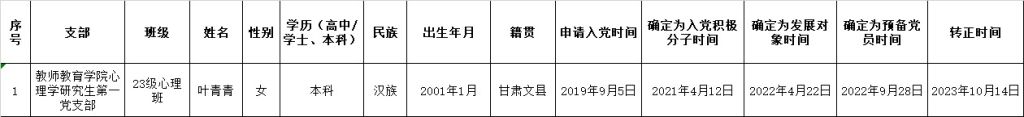 根据《中国共产党发展党员工作细则》中发展党员的文件要求,经对叶青青同志的预备党员转正条件、转正程序等进行严格审查。2023年10月17日,学院党委会集体审议讨论了叶青青同志的转正问题。党委委员共7名,实到会7名。经逐个审议和表决,7名党委委员一致认为叶青青同志已具备正式党员条件,同意批准按期转为中共正式党员,党龄从预备期满转为正式党员算起。具体名单公布如下: