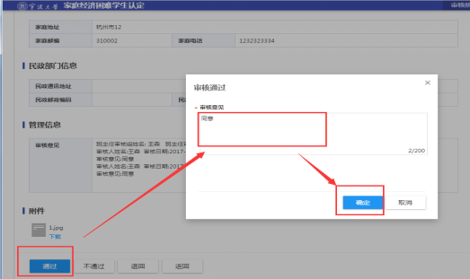 3、 通过操作:点击“通过”按钮,弹窗输入审核意见,点击确认,送至下一审核环节。
