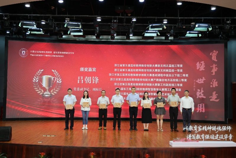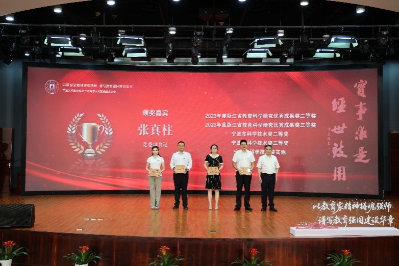 获得2023年度浙江省教育科学研究优秀成果奖二等奖的林玉慈老师(左一)颁奖