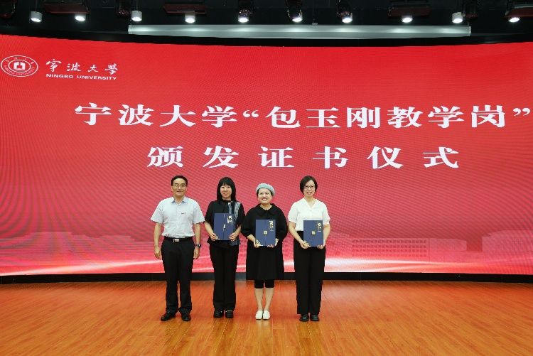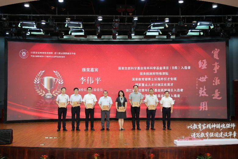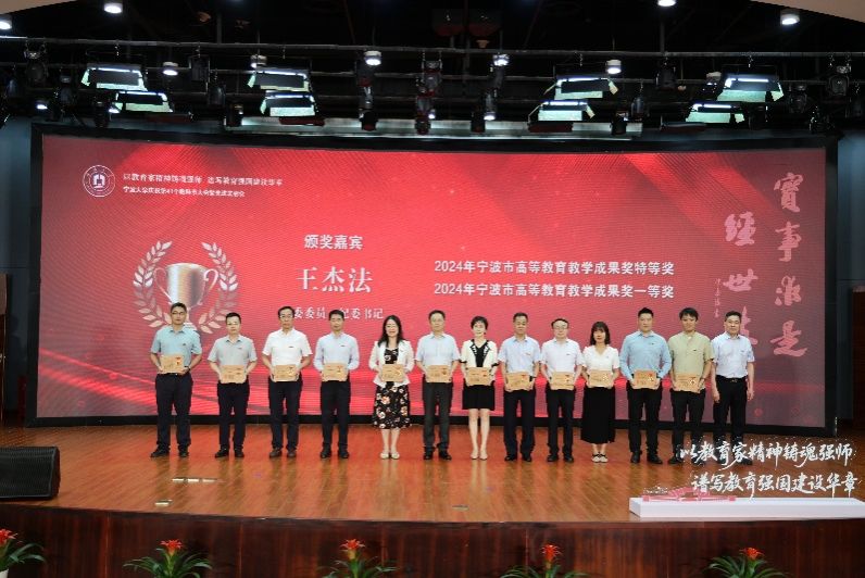 获得2024年宁波市高等教育教学成果奖一等奖的张宝歌老师(右六)、邵光华老师(左六)、刘训华老师(右五)颁奖