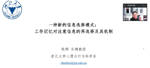承办的心理学前沿学术论坛在腾讯会议线上举行。本次讲座由浙江大学心理与行为科学系副系主任、博士生导师陈辉主讲,尹军教授主持。