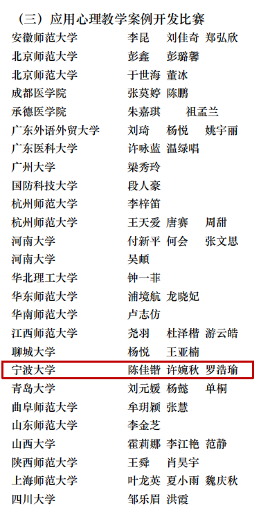 由2022级、2023级应用心理专业硕士研究生陈佳锴、许婉秋、罗浩瑜组成的团队,在尹军老师的指导下,获应用心理教学案例开发比赛三等奖;参赛作品名称《交通情境中规范遵从意愿及其影响因素分析》。