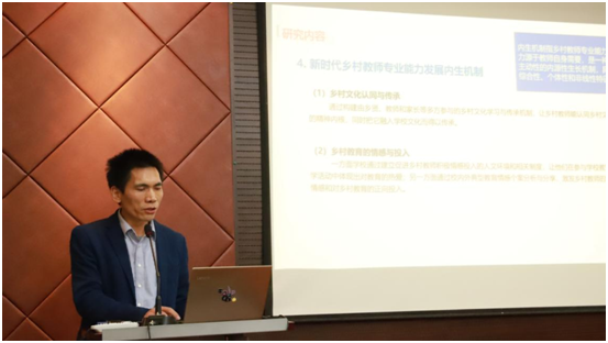 紧接着,陈柏华教授就自己的研究项目《新时代乡村教师专业能力发展困境及内生机制研究》做了汇报。陈老师围绕新时代乡村教师专业能力的发展问题,向大家做了研究介绍。本研究主要包括对乡村教师专业能力发展的理据分析,乡村教师专业能力发展现实困境,乡村教师专业能力发展影响因素和乡村教师专业能力发展内生机制等。