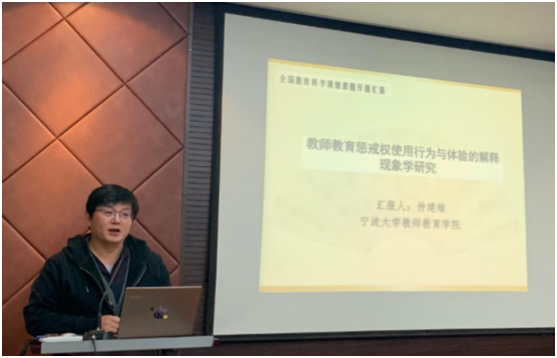 接下来,仲建维副教授介绍了自己的课题——《教师教育惩戒权使用行为与体验的解释现象学研究》。仲老师从解释现象学的视角出发,介绍了教师教育惩戒权使用行为与体验的研究。课题指出,目前关于教师教育惩戒权的相关研究还比较单薄。本研究围绕于教师实施教育惩戒权的行为和体验的关键问题,以中小学教师为研究的对象,以期对教师教育惩戒权及使用做出系统性的理论思考。