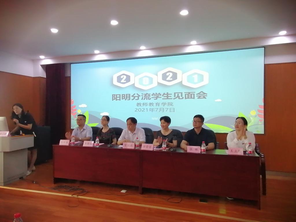 在实验楼211举行阳明学院分流新生见面会。会议由学工办主任龚小虹老师主持,院长贺国庆、党委书记方莹芬、副院长李慧仙、副院长张林、副院长刘希伟、党委副书记王立衡,应用心理学系主任焦岚、副主任徐强,党政办主任张爱娟,教务办主任吴菲菲,学院相关办公室负责老师、学工办全体成员及39名2020级应用心理学专业学生参加见面会。