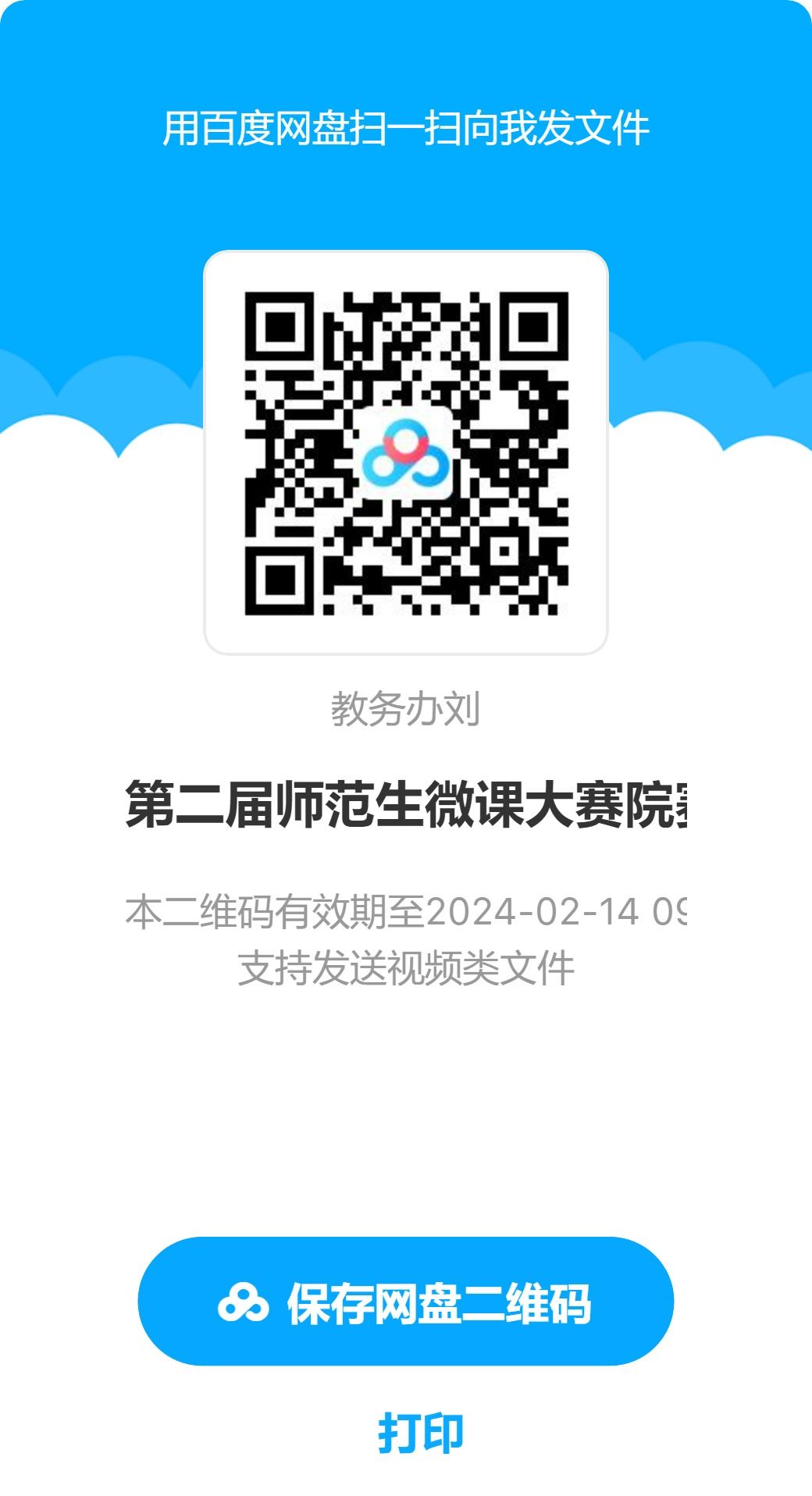 参加院赛的作品由参赛选手自行上传到百度网盘(网盘二维码如下),上传截止日期2月12日16:00,命名格式:本科生(or研究生)+姓名+学科+作品名称。