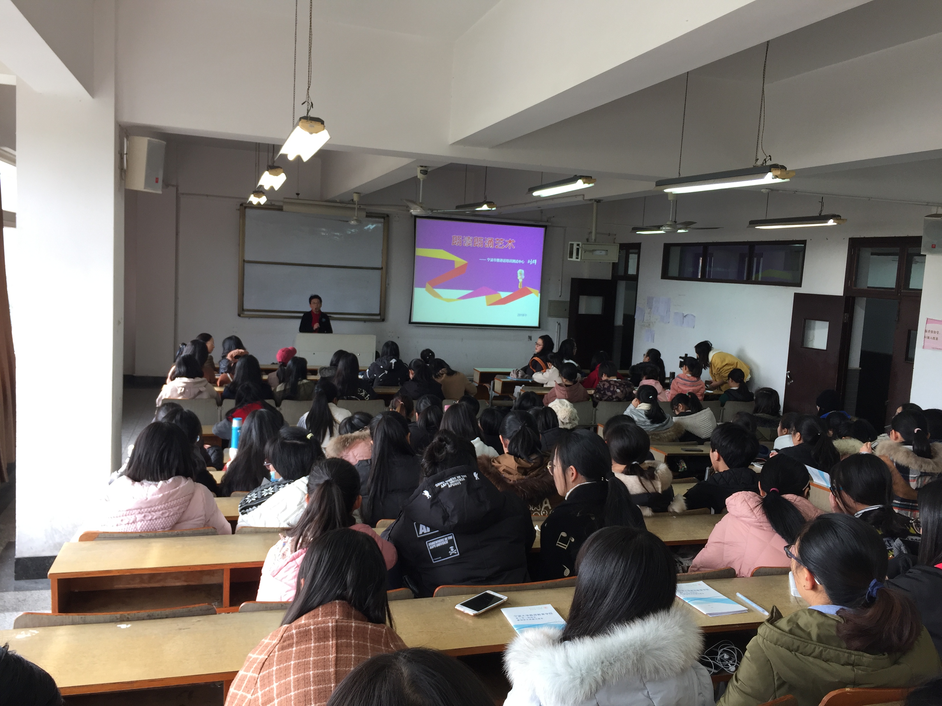 “教育智慧大讲堂”第八十七讲“朗读朗诵艺术”在四号教学楼105准时开讲。讲座邀请了宁波市普通话测试中心刘群老师主讲。17级小教专业学生到场聆听。