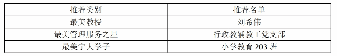 根据校党委宣传部下发的《关于开展成人论坛 2024年“最美宁大人”系列评选活动的通知》精神,经申报材料报送和学院党政联席会议研究,现将拟推荐名单公示如下: