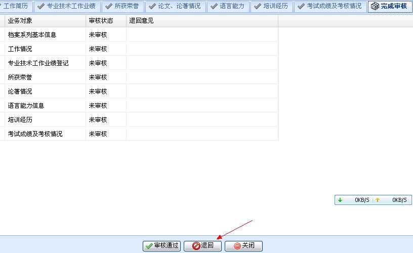 四、学院人事秘书可在职称申报系统“学院申报审核”模块中退回申报者的材料。如需操作退回申报者全部材料,可点击“完成审核”中的“退回”按钮。