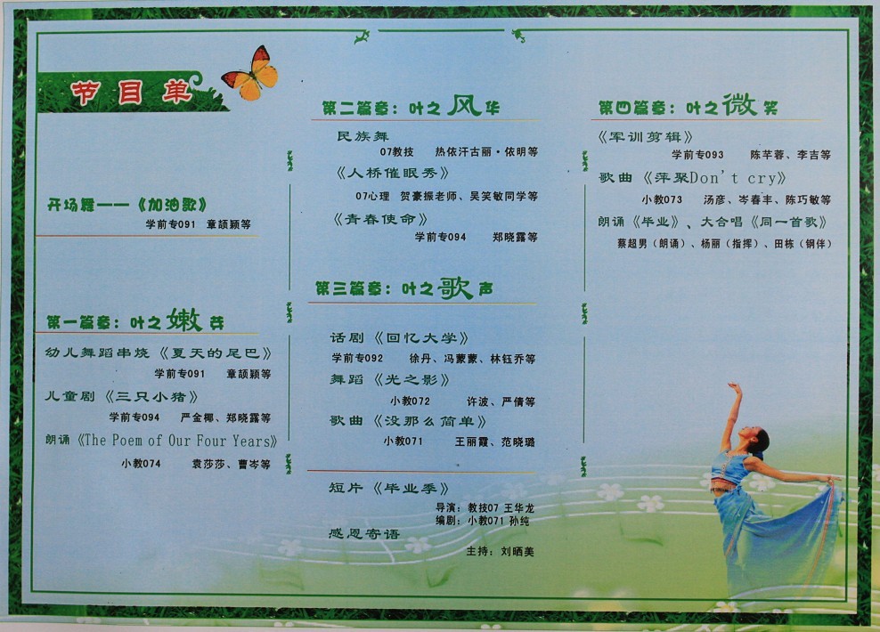 你们好,成人论坛 《2011年成人论坛 “碧叶对根的情意”毕业生晚会》的彩排工作已经结束,现将晚会时间、节目单公布,敬请届时光临!
