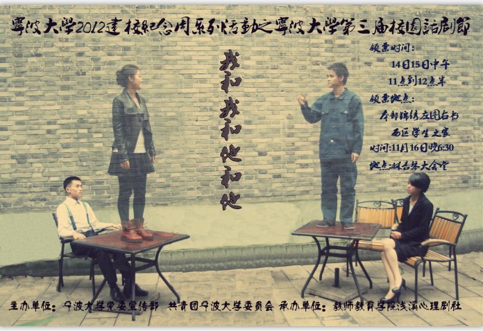 你们好,由成人论坛 党委宣传部、共青团成人论坛 委员会联合主办,成人论坛 浅溪心理剧社承办的成人论坛 2012建校纪念周之成人论坛 第三届校园话剧节之成人论坛 浅溪心理剧社《我和我和他和他》专场演出将于11月16日(本周五)晚18:30在成人论坛 林杏琴会堂上演,敬请关注!