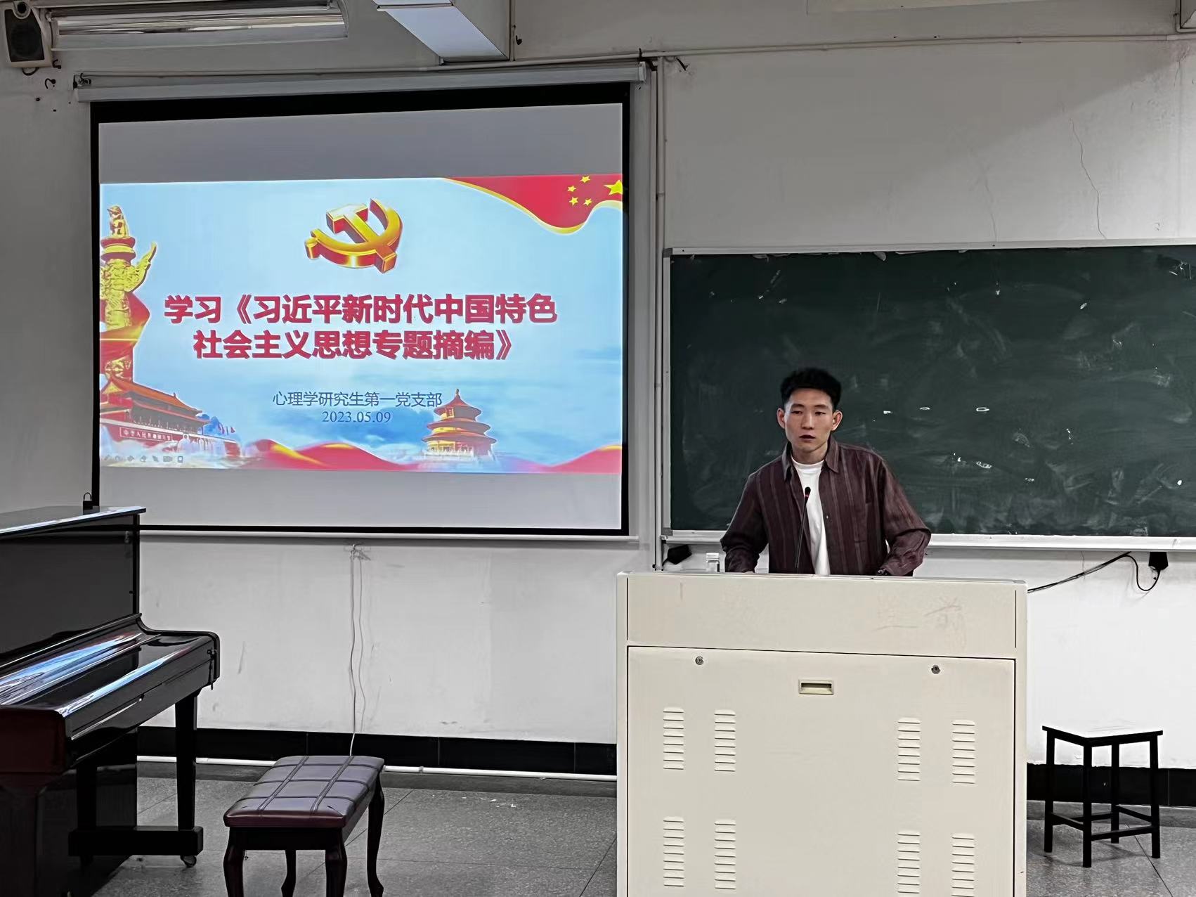 5月9日晚,心理学研究生第一党支部于西区实验楼111教室开展了《习近平新时代中国特色社会主义思想专题摘编》的集中理论学习活动,全体正式党员、预备党员及发展对象参加了本次学习活动。心理学研究生第一党支部副书记杨鑫超同志作为本次活动的领学人,深入解读了新时代中国特色社会主义思想的精神实质和丰富内涵,围绕着“十四个坚持”、“八个明确”、“两个维护”等内容带领支部成员开展党支部第一次主题教育集中理论学习。